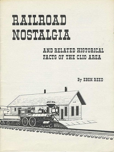 The booklet titled RAILROAD NOSTALGIA by Eben Reed was published on May 15, 1981. Mr. Reed contracted artist Michelle MacDonald to create the cover. The artwork shows the first railroad engine used on the Flint and Pere Marquette railroad in Clio in 1859.